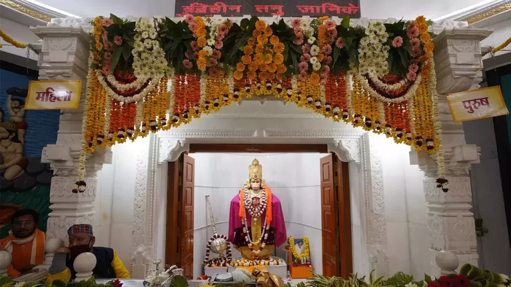 Here, the central idol of Lord Hanuman stands adorned and revered. The devotional atmosphere is palpable, strengthened by traditional decorations and spiritual reverence.